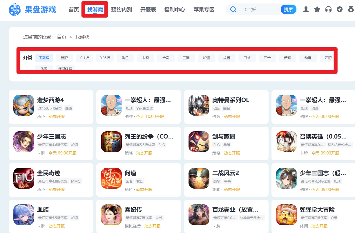 果盘游戏是一个汇聚了海量手机游戏的专业平台,不管你偏好角色扮演、跑酷、RPG、即时战斗类型,还是钟情战略游戏、卡牌三国、消除游戏、放置类游戏,甚至对西游和三国题材感兴趣,在这里都能找到。平台已累计收录200多款游戏,分类十分细致。下面是果盘游戏的网页版,打开即可查找自己喜欢的游戏。