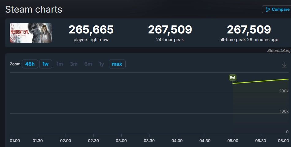 今日,备受期待的恐怖游戏新作《生化危机9:安魂曲》正式发售,上线后迅速打破系列在Steam平台的人气纪录。游戏发售仅一小时,同时在线玩家数量就突破26.7万,创下系列历史最高纪录。而此前这一纪录的保持者是《生化危机4:重制版》,它的在线峰值为16.8万。