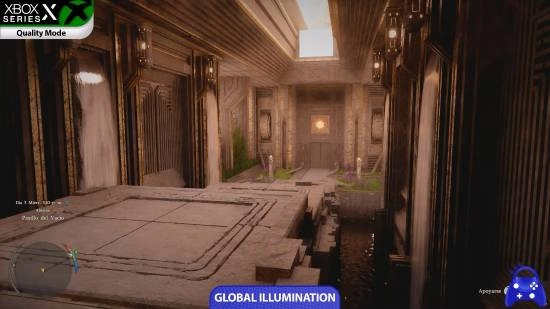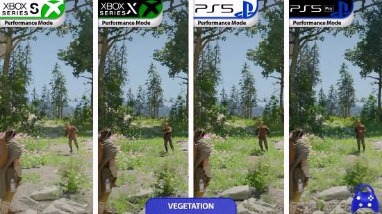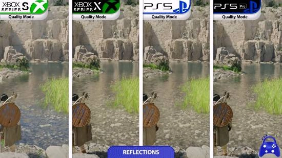 不同版本和模式之间最明显的差异体现在全局光照质量上,其中只有PS5 Pro能够在性能模式下维持中等级别的光线追踪效果。