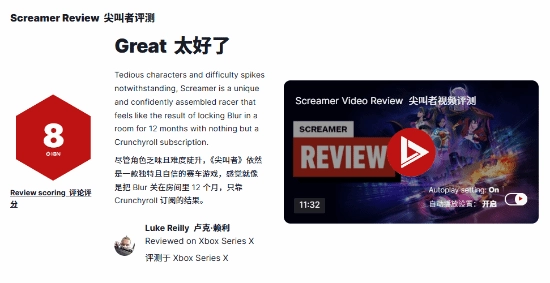 今日,IGN给《Screamer》打出了8分的高分评价。测评者指出,这是一款结合了武器竞速与漂移驾驶元素的游戏,画面火爆、节奏激昂,还带有浓郁的动漫风格。游戏不仅视觉效果十分惊艳,制作也相当扎实,是一款颇具挑战性的街机风格竞速作品,并且拥有鲜明的独特风格。