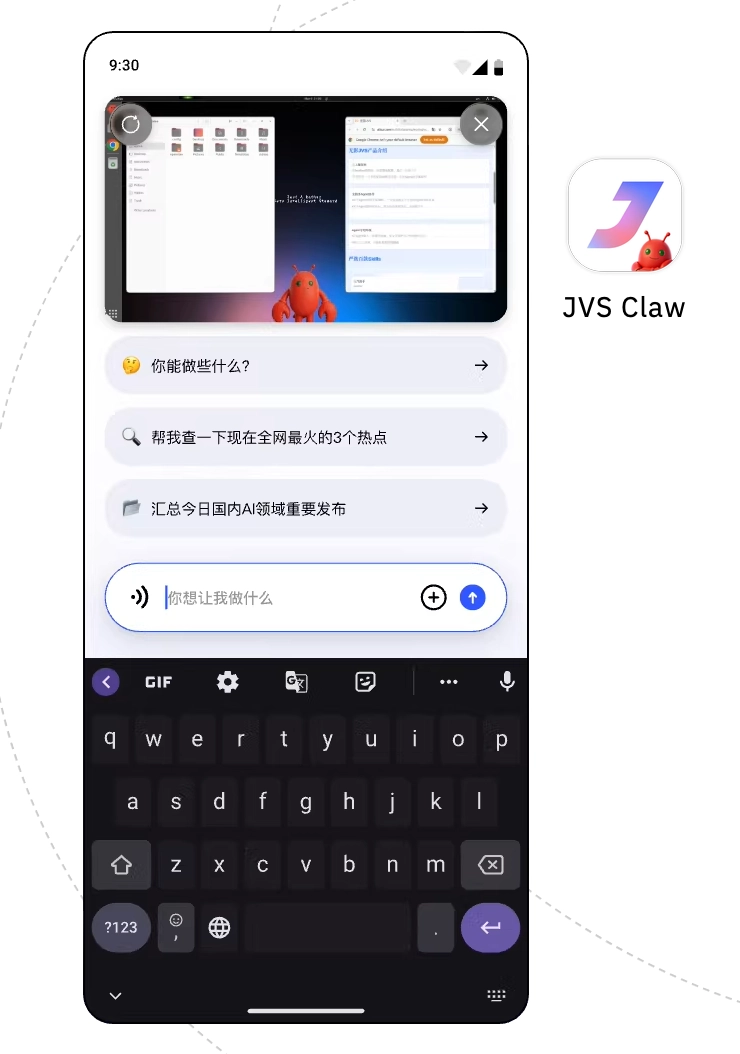 更早些时候,阿里已经推出了JVS Claw,它是一种为PC打造的「龙虾」工具。同时,JVS Claw还有手机客户端,这样用户就能直接在手机上操控电脑上的「龙虾」。