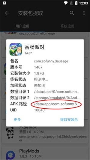 2、找到并点击自己需要提取安装包的游戏(小编以香肠派对为例);