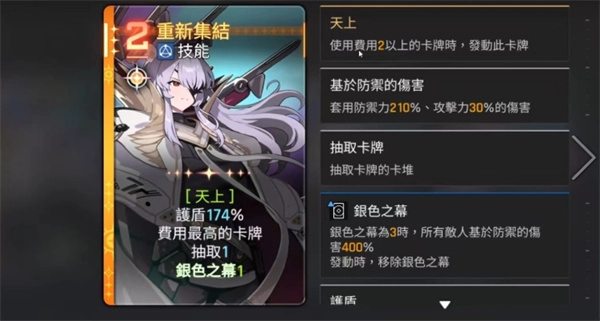 获得120%护盾并抽取一张最高费用手牌,增强下回合战术调度能力。