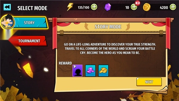 3、右下角提供剧情章节和锦标赛入口,新手建议从第一章开始,熟悉基础操作和敌人行为模式。