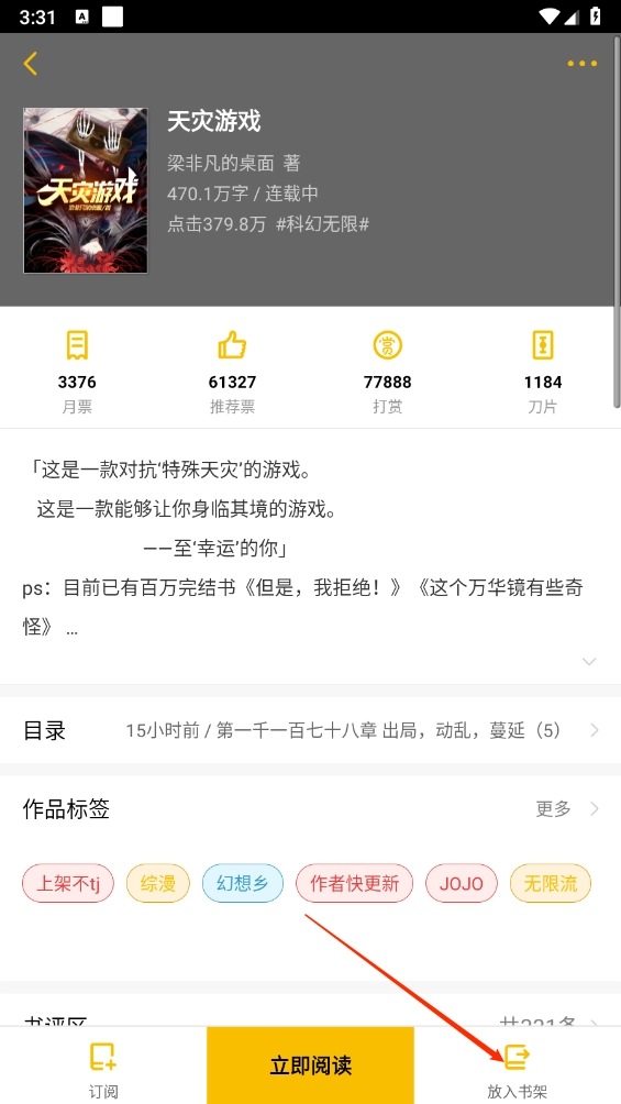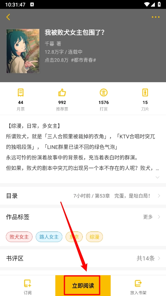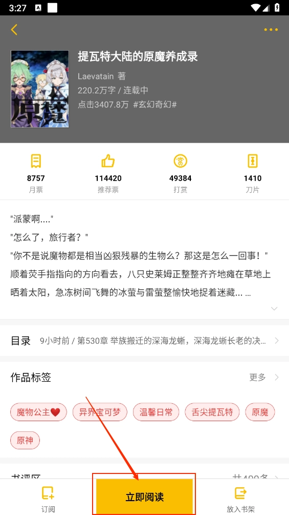 3. 点击小说封面进入详情页,选择"立即阅读"。