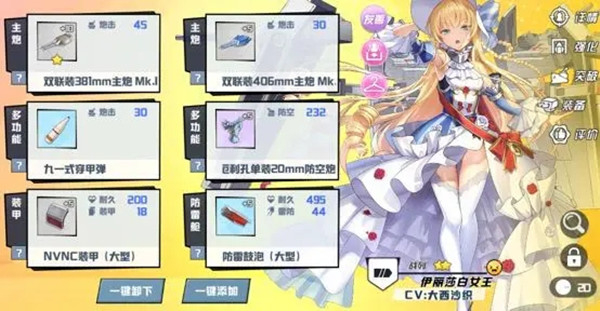 6、提升战力最重要的因素之一,就是装备,这里装备就讲究了,根据角色不同装备区的需求也不一样,当然颜色上就不用说了,不同的地方在于有的角色可以装副炮可以装鱼雷,有的可以装双鱼雷,具体哪个角色适合什么就留给指挥官自己探索了,我只建议一点:无论巡洋舰装的什么花里胡哨的,防空武器必不可少,要记住我说的,海战的霸主永远是航母;