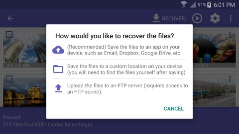 DiskDigger Pro 为您提供了三种不同的方式来保存可恢复文件:保存到应用程序、保存到设备和 FTP 上传,下面分别讨论。 要恢复一个或多个文件,请点击要恢复的可恢复文件旁边的复选标记,然后点击顶部工具栏中的“恢复”按钮。