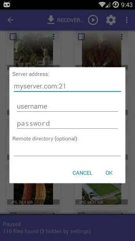 最后一种方法允许您将可恢复文件上传到 FTP 服务器。为此,您需要访问在线的 FTP 服务器,并使用正确的凭据来访问和上传到服务器。DiskDigger Pro 将显示一个对话框,供您输入 FTP 服务器的主机名,以及登录服务器的用户名和密码: