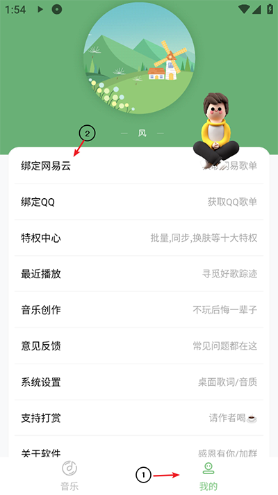 1如下图所示,这里展示的是如何导入网易云音乐的歌单。首先,进入“我的”页面,接着点击绑定“网易云音乐”。