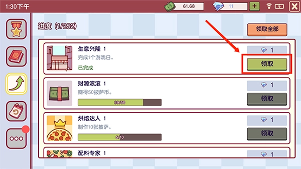 成就领取:点击收银台手机→成就图标→领取红点奖励