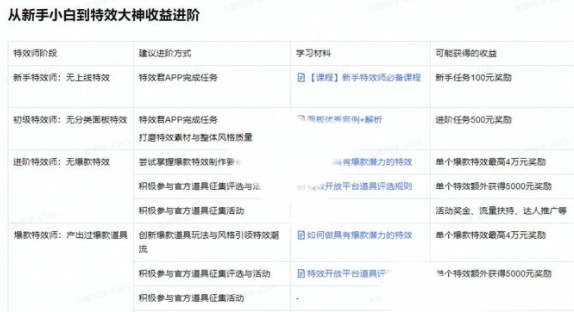 APP中注册特效师的收益来自抖音和火山两个平台,总收益由三部分构成:单日投稿峰值次数奖励、特效评选奖励和基本奖励。制作出的特效可提供给多平台用户使用,不同平台收益叠加计算。目前仅抖音和火山接入收益系统,其他平台暂未开放。