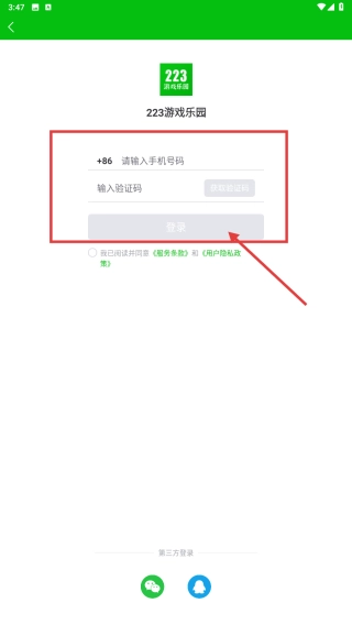 3、输入您的手机号码和验证码,选中协议选项,然后点击登录按钮,以完成账号登录。