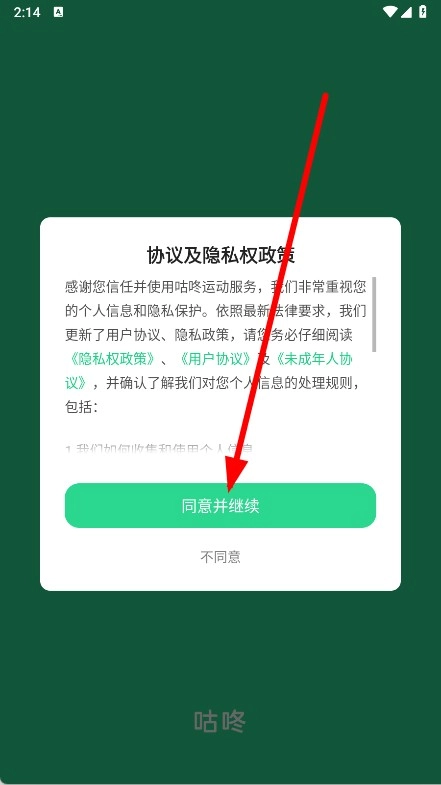 1、启动咕咚应用,在弹出的窗口里点击“同意并继续”按钮。
