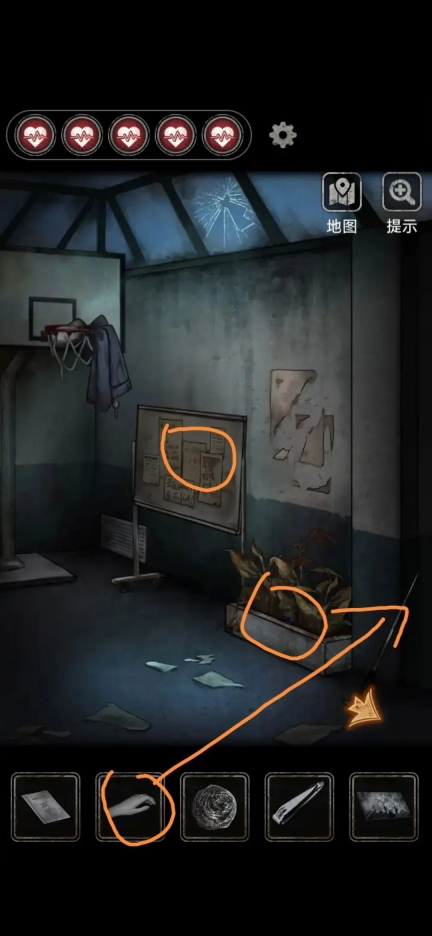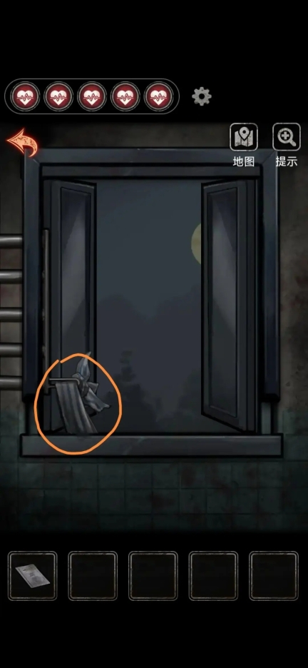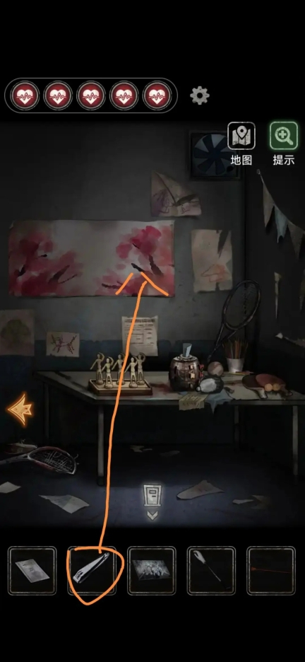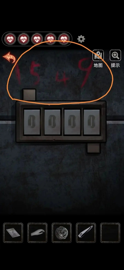 点击图中位置拿到抹布,用玻璃球堵住管道后放满水,海绵和抹布放入浸湿,用假手拐杖和抹布组合擦干玻璃上污渍,得到提示密码:5823
