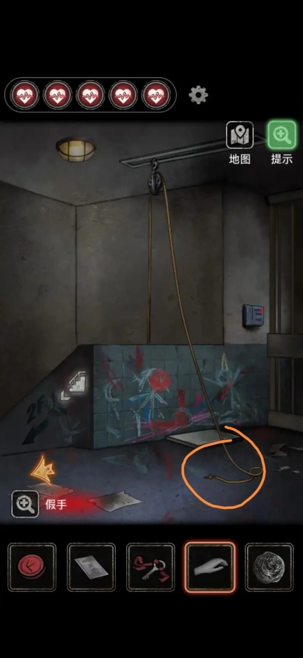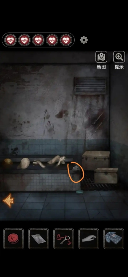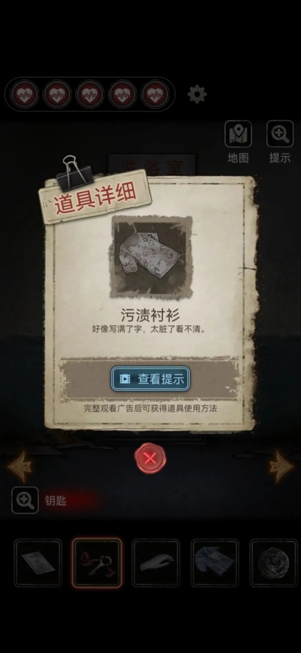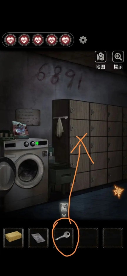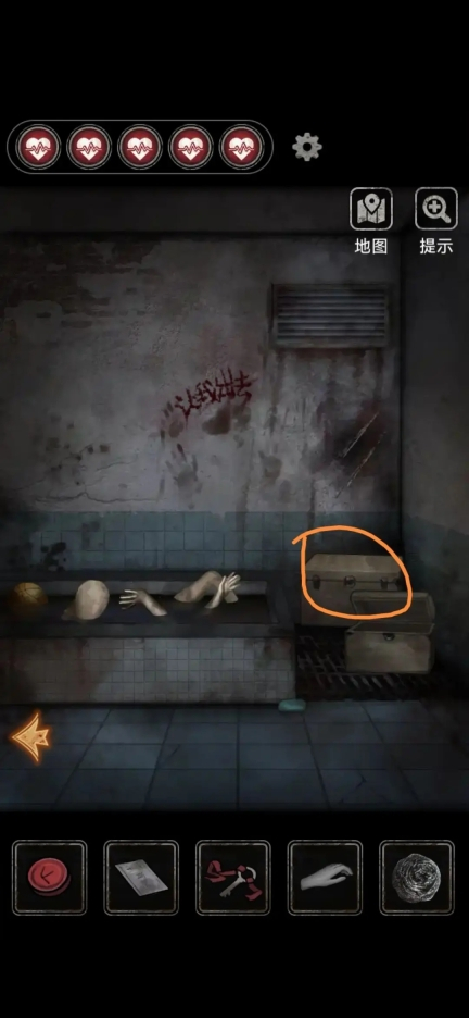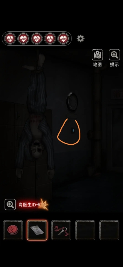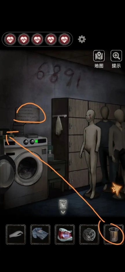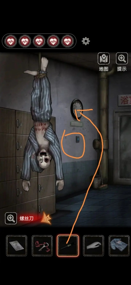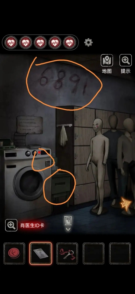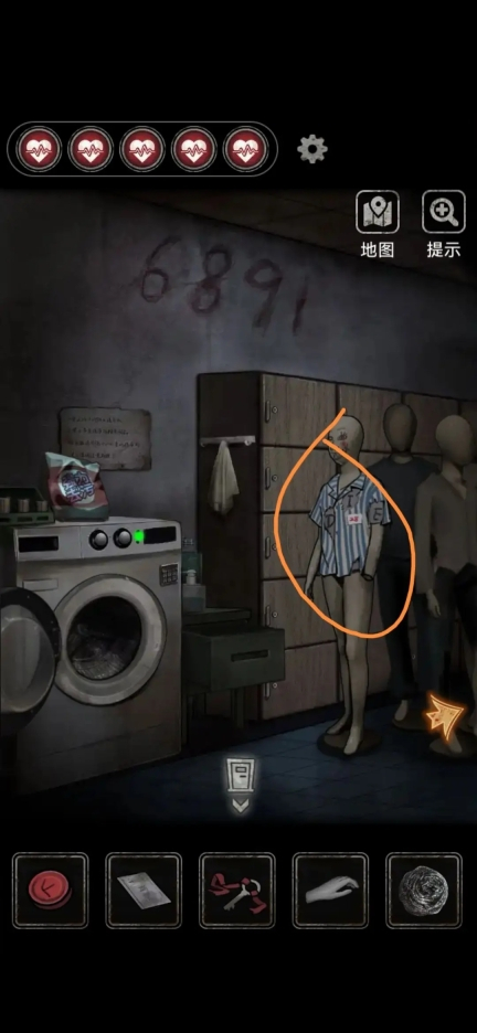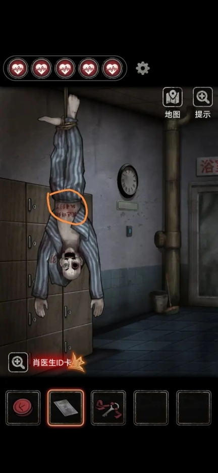 进入洗浴室按蓝色开关打开灯,点击倒挂的假人得到提示结合墙上文字可知洗衣机密码:1689,点击洗衣机输入解锁,点击排水,打开洗衣机得到假手和破衣服,点击抽屉用肖医生的卡刮拉出抽屉得到螺丝刀