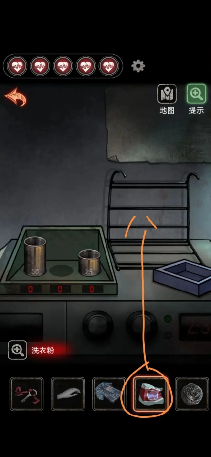 点击墙上的纸得到提示要40的洗衣粉,把量杯洗衣粉放入对应位置进行调配后倒入洗衣粉盒,把洗衣粉盒插入洗衣机