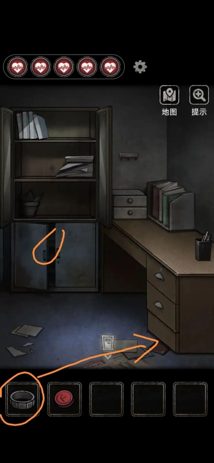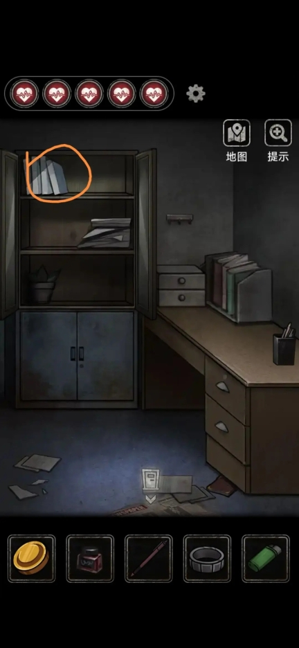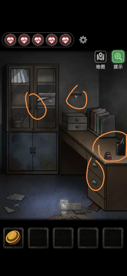 打开办公室门进入点击桌面得到红墨水,笔,从书桌柜得到打火机和小零件,从墙上得到2009号房间钥匙,打开资料柜点击得到资料信息,用钥匙打开2009号房间门