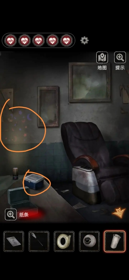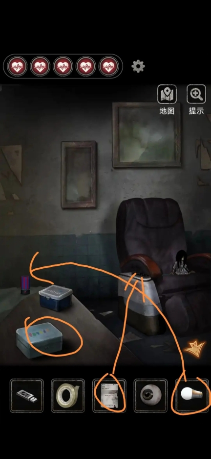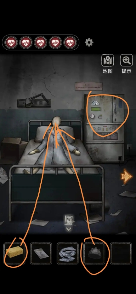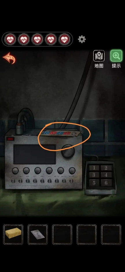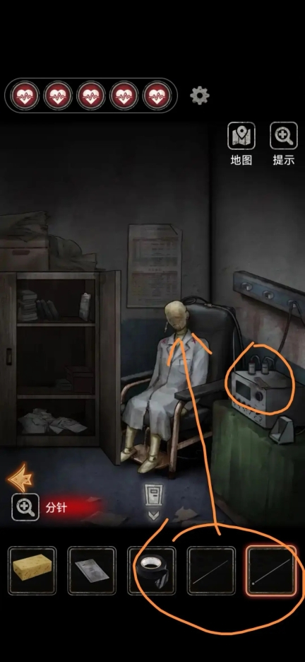 用绝缘胶布针灸针分针安装在设备上,点击红色开关开启,根据骰子提示得到密码:6551,输入后启动治疗,得到洗浴室衣柜钥匙