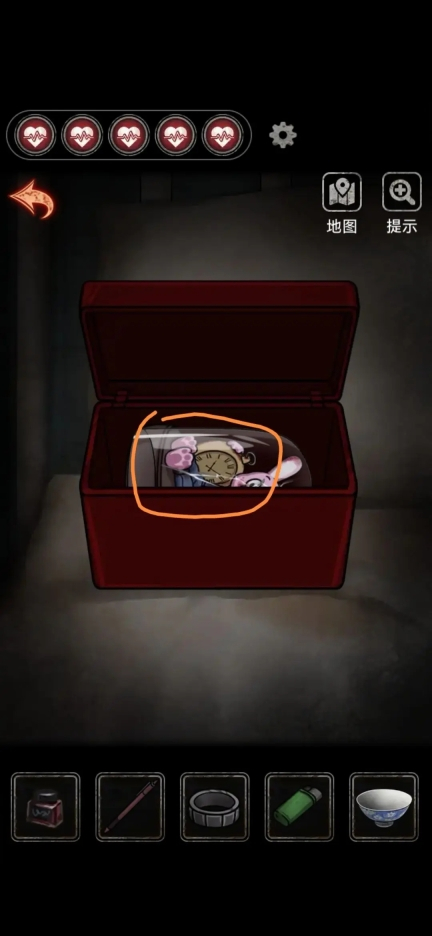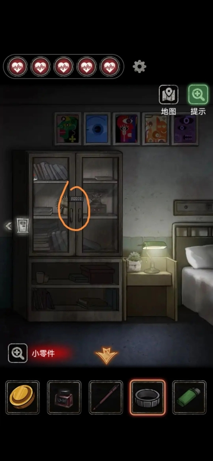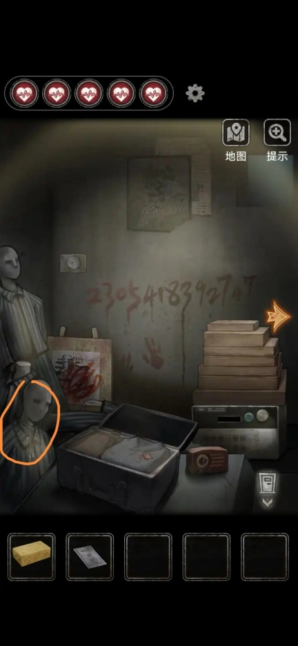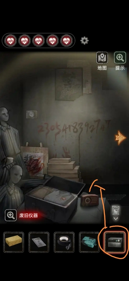 点击床下,移开木偶得到资料,往后翻得到密码提示,根据柜子左上角提示可知柜子密码:913707,输入打开柜子,移开二层的杂物得到表和绝缘胶布,点击表的裂痕得到分针