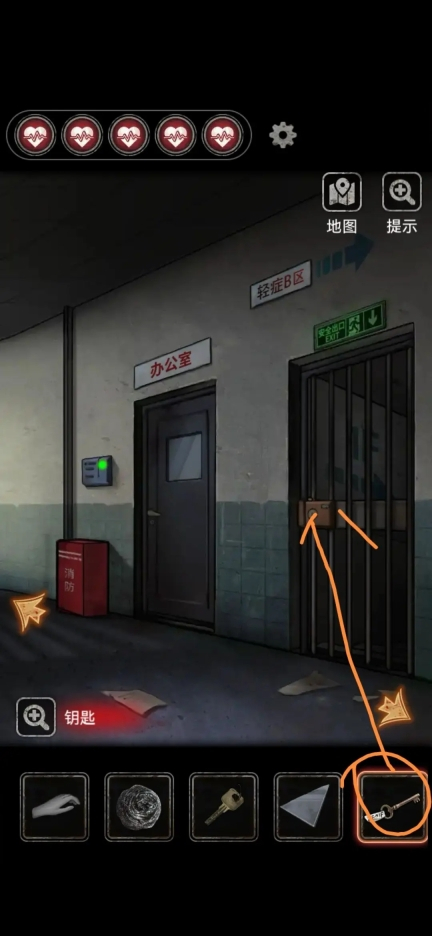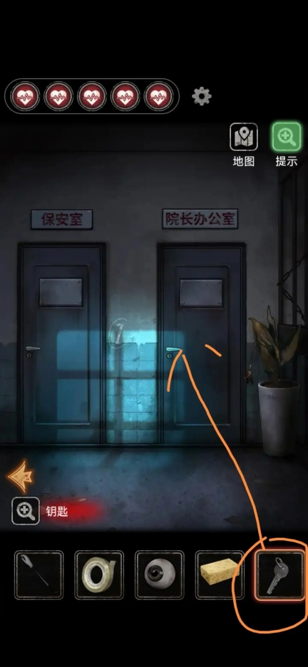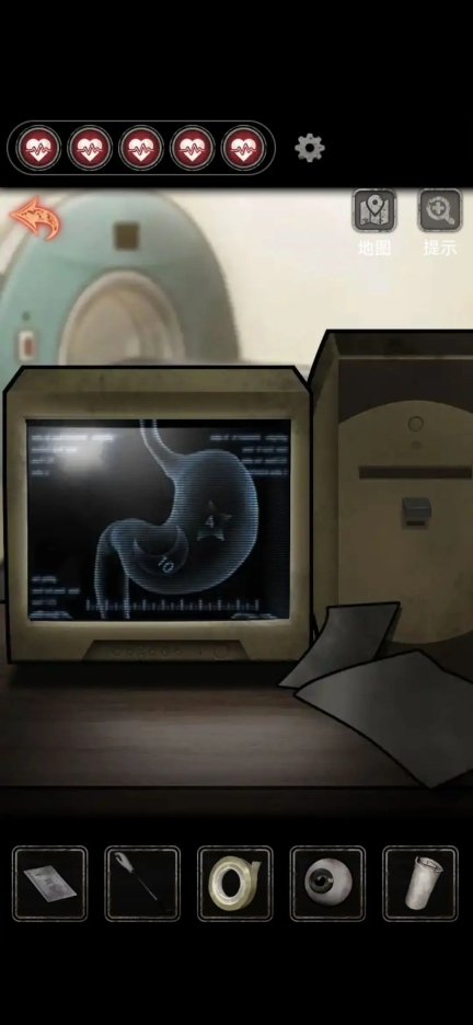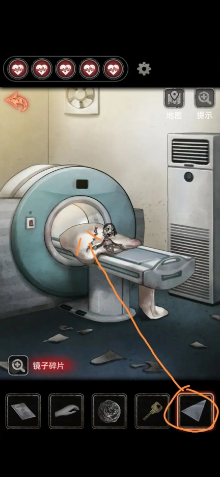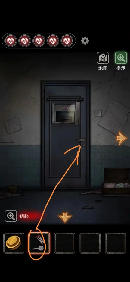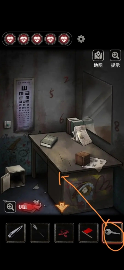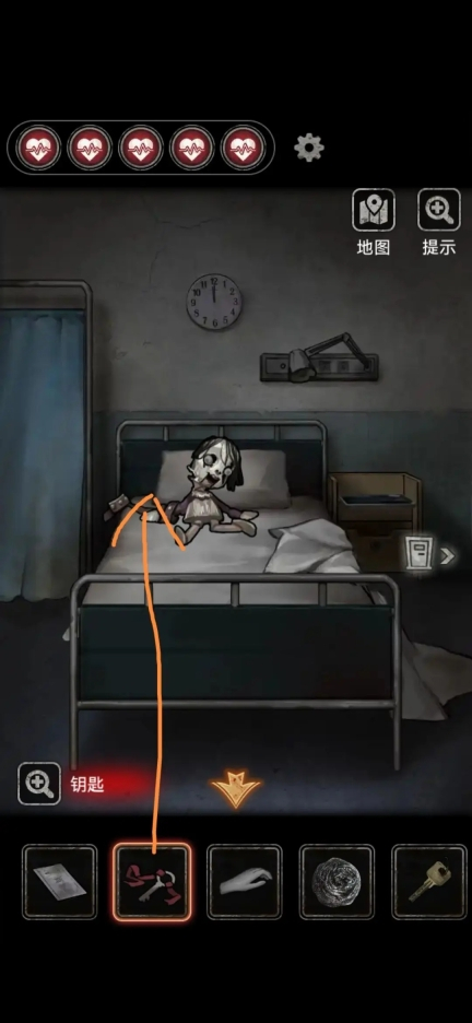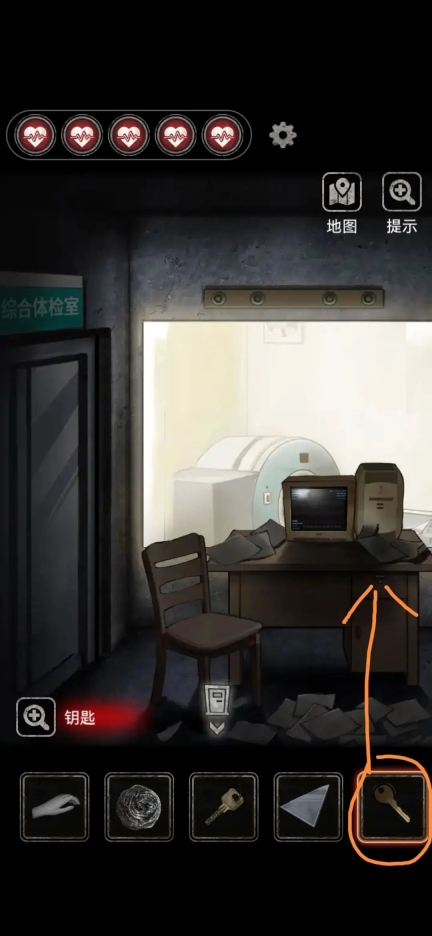 回到检查室,点击开关拉出,用镜子碎片划破布袋得到钥匙