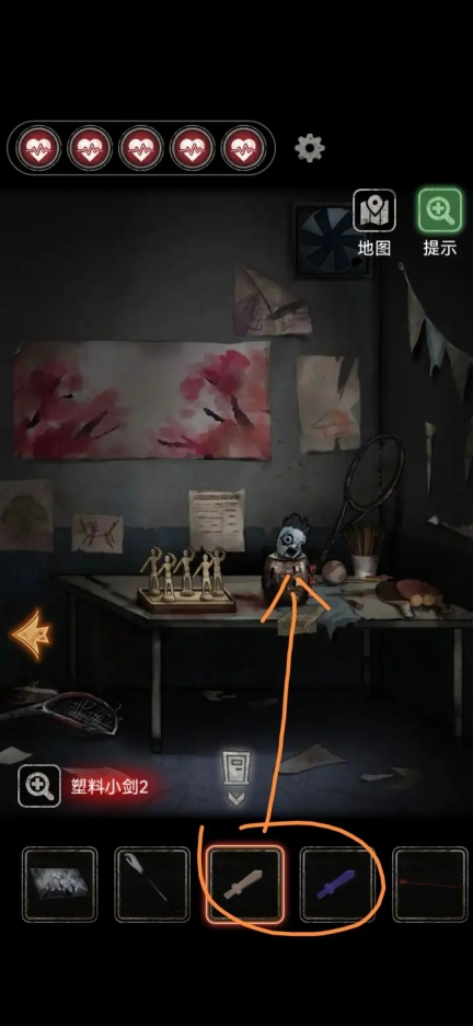 进入娱乐室用假手和拐杖组合得到假手拐杖,点击图上两处得到红蓝塑料小剑