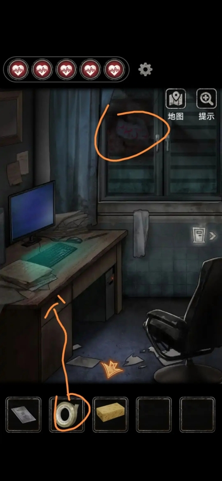按照提示,将5823输入到电脑桌的抽屉里,然后用透明胶带把碎纸条粘好,从而得到电脑密码:638264,第四章结束。