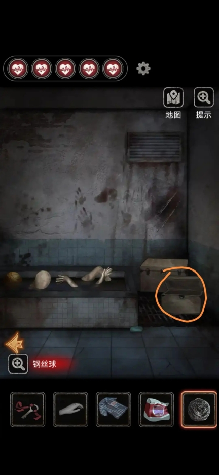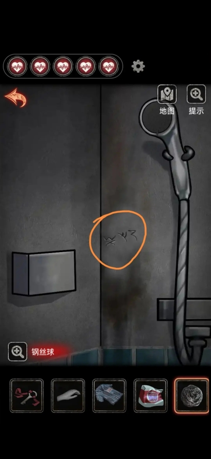 进入浴室后点击取得钢丝球,在淋浴区点击获取洗衣粉,然后使用钢丝球清理墙上的污渍以获得密码提示。