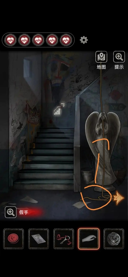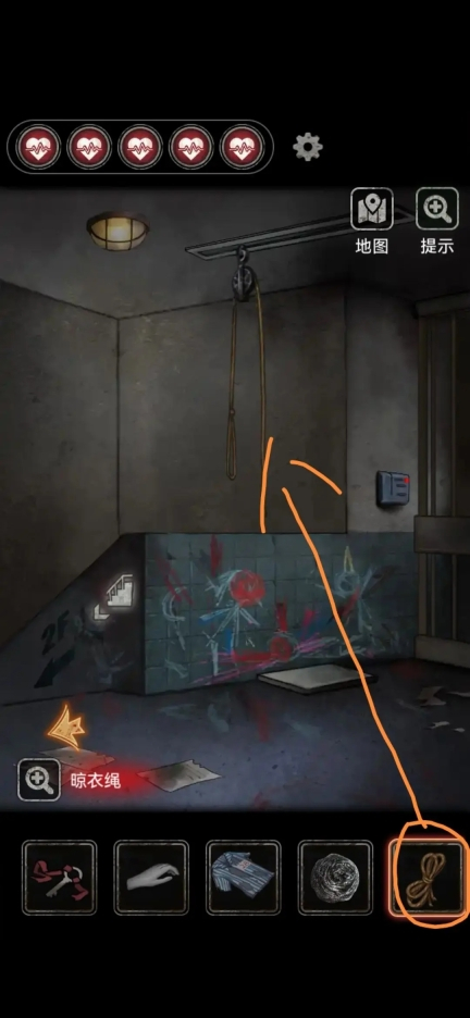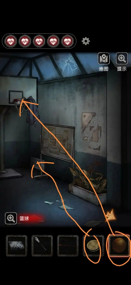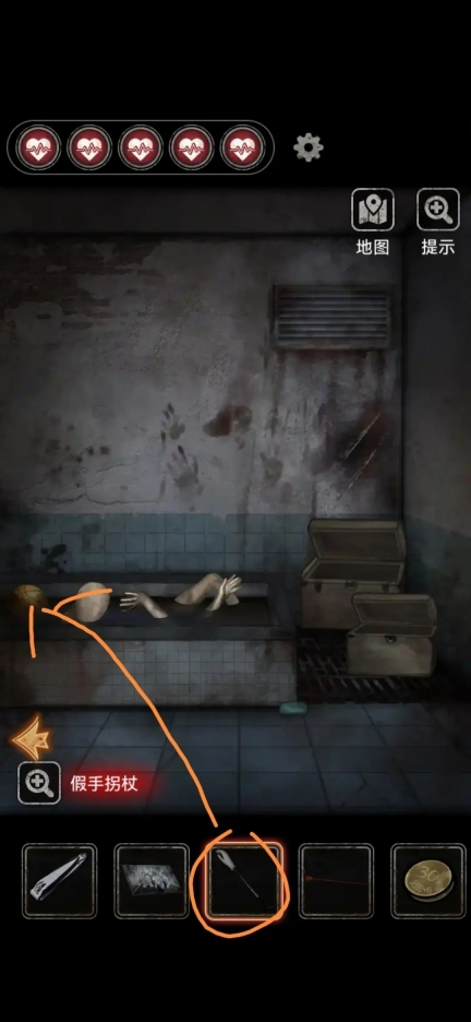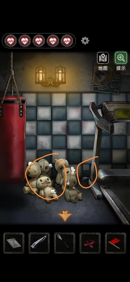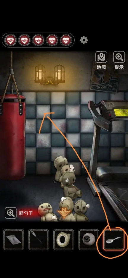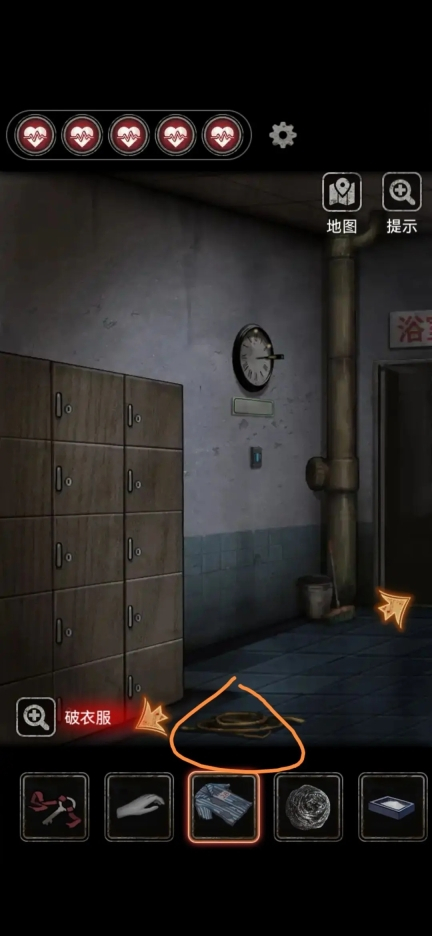 回到浴室用假手拐杖拿到篮球,回到娱乐室用篮球打下衣服,用硬币打开管道后拿痒痒挠勾,分别得到钥匙和发带