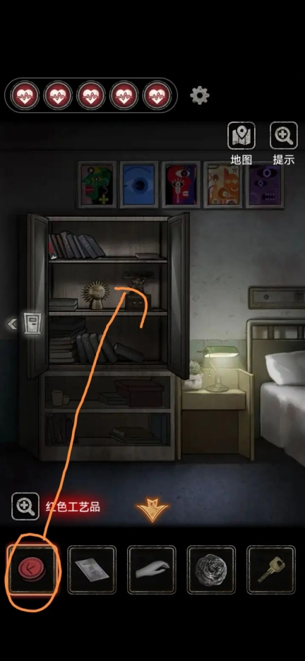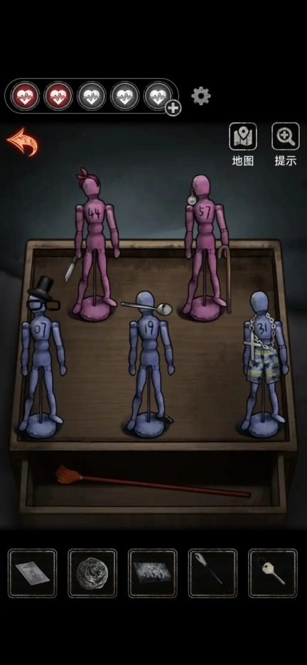 回到检查室,点击开关,把木偶放上后关上开关,回到电脑面前观察得到提示。回到2009号房间,点击墙上的一排画得到提示,把红色和紫色工艺品放入图中工艺品凹槽中,调整图案,得到石头