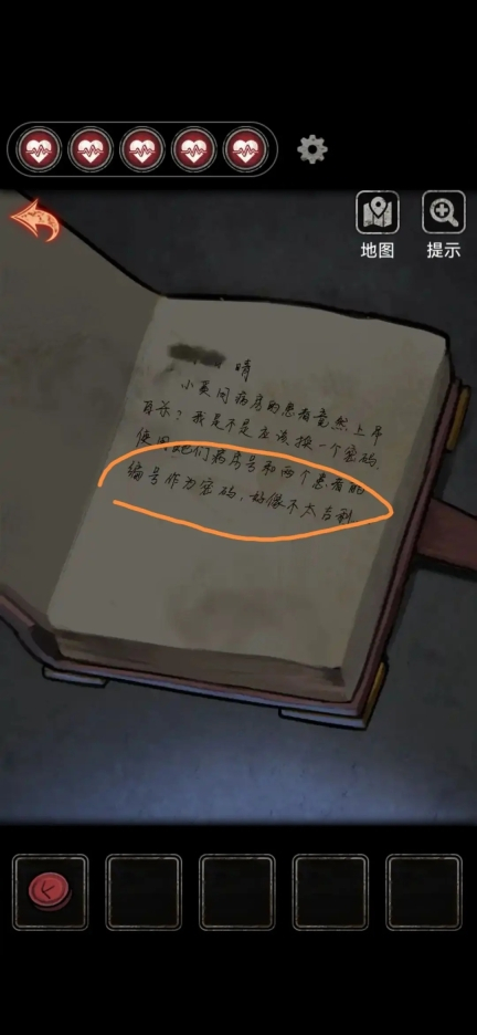 用小零件装在办公室地上的日记本上,打开日记本一直往后翻得到密码提示和肖医生的卡,根据之前镜子前的信息结合房号可以知道密码是20114457,打开书柜下面的门,输入20114457打开密码锁得到两把钥匙