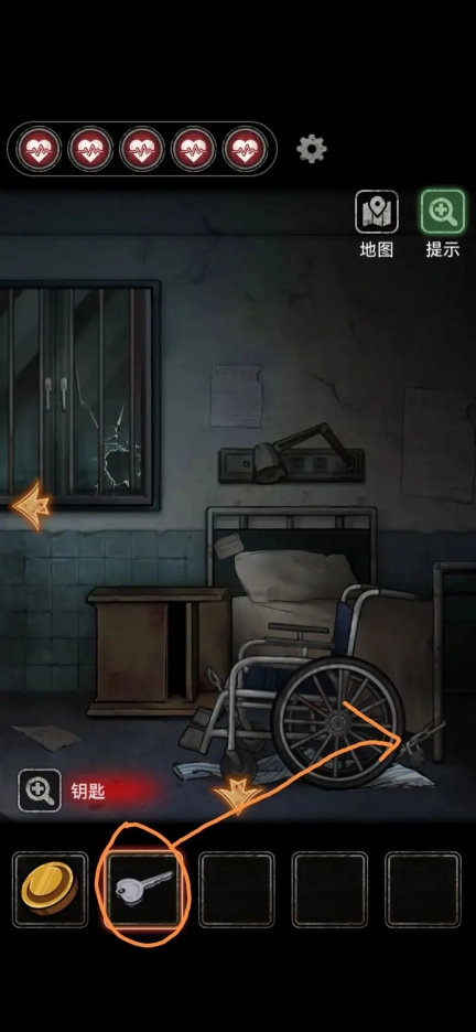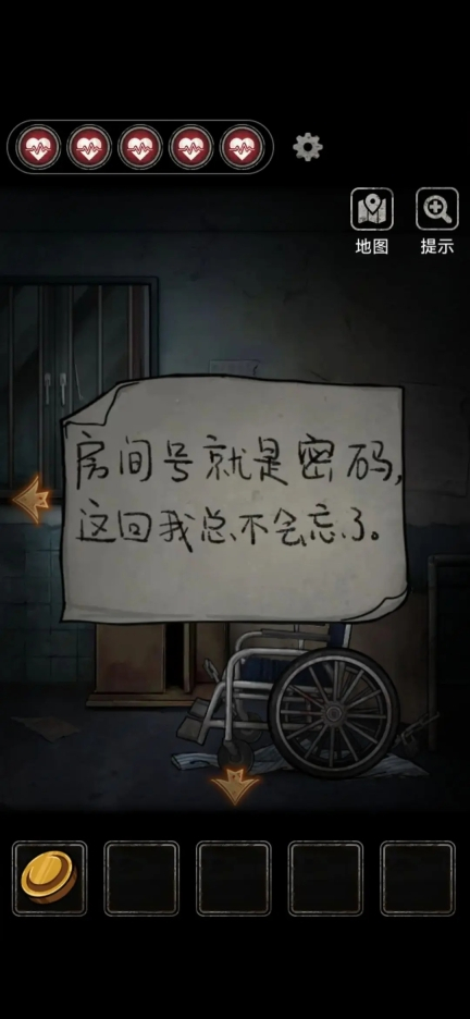 用钥匙解开轮椅的锁,点击推动轮椅,点击衣服捋平后得到房间门钥匙,打开门,进入第一章