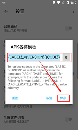 3在“APK名称模板”列表项中,输入您想要修改的模板名称,然后点击“保存”按钮。