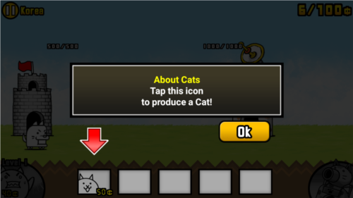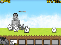 3、点击BATTLE!!之后就进入游戏了,游戏界面如下,那个奇怪的柱状物就是我们的老家了,我们的任务就是守护老家。那些汪星人就是我们的敌人,我们需要做的就是等右上角的钱数增长以后开启左下角的按钮让塔里的猫咪能力更强或者生产喵星人。游戏初期可以选择的喵星人兵种很少,只有这一种,后期会有很多不同类型的喵星人,而敌人的类型也会增多,小蛇大猩猩神马的应有尽有。如果敌人直接压到我方塔下我们的塔的生命就会减少,到零的时候就会GAMEOVER。