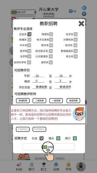 3、这里有三种招聘方式,每种招聘的专业能力都不一样,越高级的招聘找到的教师团队就越优秀,不过前期由于资金不足,先从最基础的开始招聘吧!