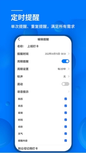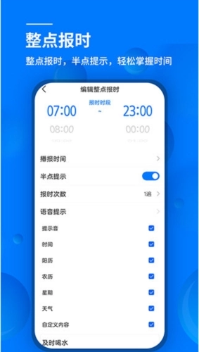 报时功能覆盖整点、半点及任意自定义时刻。快捷操作包括桌面小工具、锁屏报时和摇动触发。定时器与日历提醒无缝集成。播报内容可选时间、农历或节气。重响设置允许调整次数和间隔。录音直接转为铃声,简化流程。每个闹钟独立音量控制。支持跳过单个闹钟或全局静音。语音播报兼容12/24小时制,背景音乐可自定义。