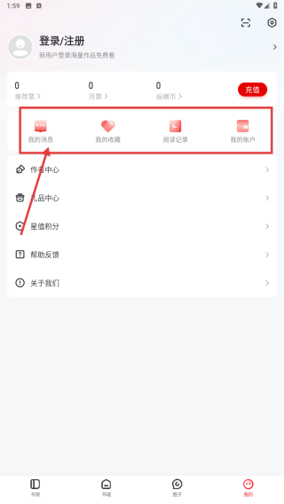 3、打开登录/注册页,进入我的书架、收藏等模块,管理阅读记录、收藏作品,同步阅读进度。