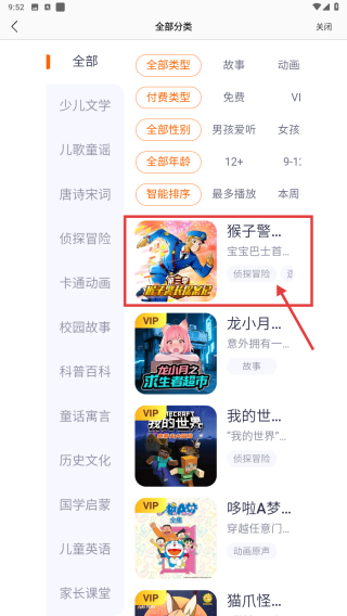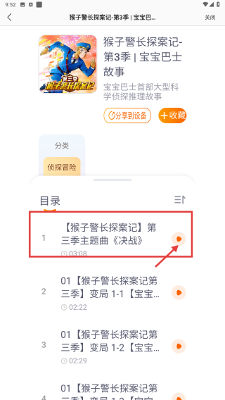 4、在内容列表的目录里,点击猴子警长探案记第三季主题曲决战条目,开始播放该音频。