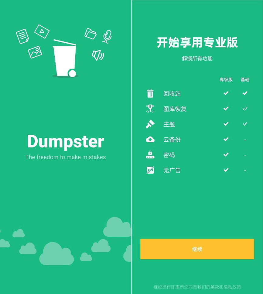 1、首先在手机中安装“Dumpster回收站”,该软件由于对系统权限要求较高,目前仅有安卓版,iOS 暂未找到类似工具。安装后打开,可以直接看到已是专业版,免费,如图所示。