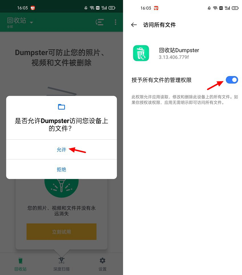 2、首次使用会需要允许「Dumpster」访问设备上的文件,根据提示点击「允许」,再开启权限即可,如图所示。