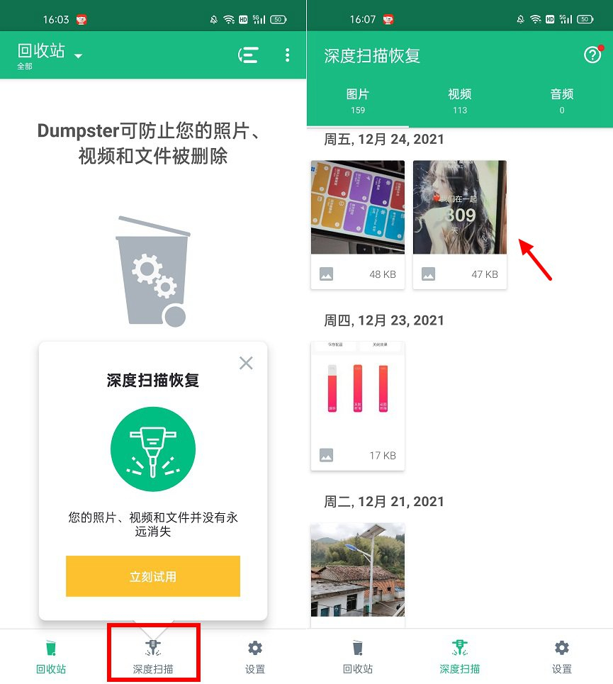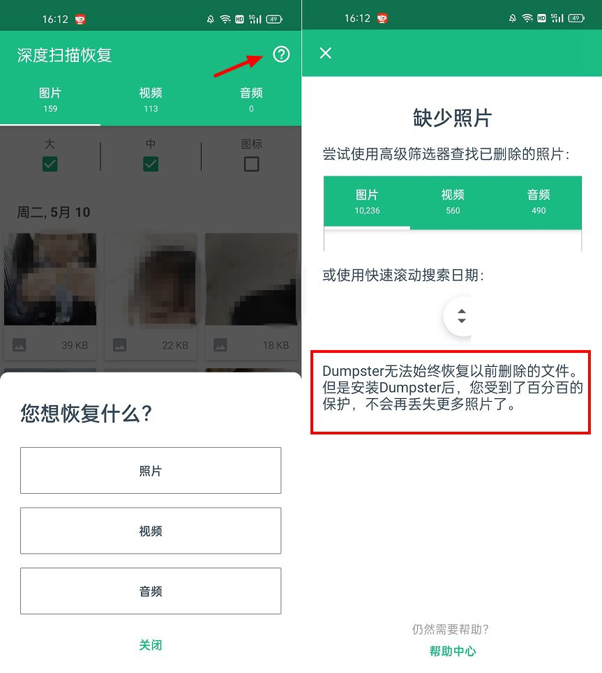 1、恢复照片我们都曾遇到过这种情况。当您发现设备上的一些重要文件被误删时,往往为时已晚。但现在情况不同了!Dumpster是一款免费的Android数据恢复应用程序,它可以暂时保存所有被删除的文件、图片、视频等,以便您日后可以轻松恢复它们。