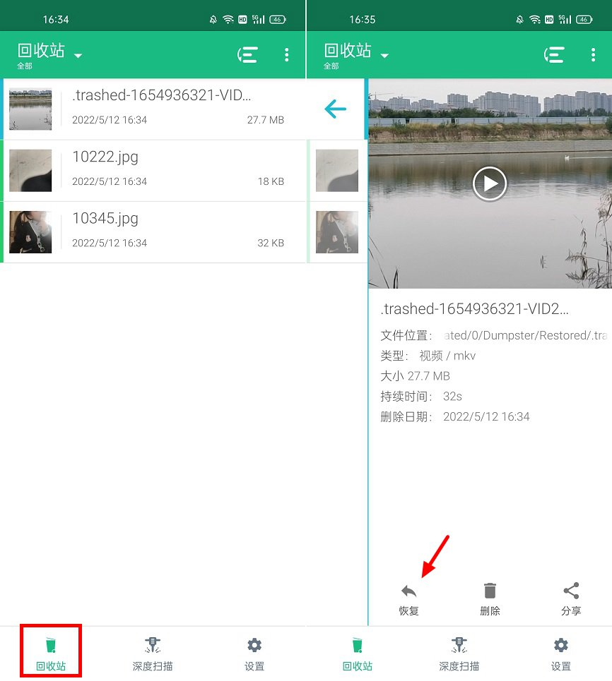 比如,在 图片 里面,我们可以找到之前删除过的一些图片。如果找到自己感兴趣的图片,可以点击进入查看,然后点击下方的「恢复」即可,恢复的图片会保存到手机相册中,进入相册即可找到,如图所示。