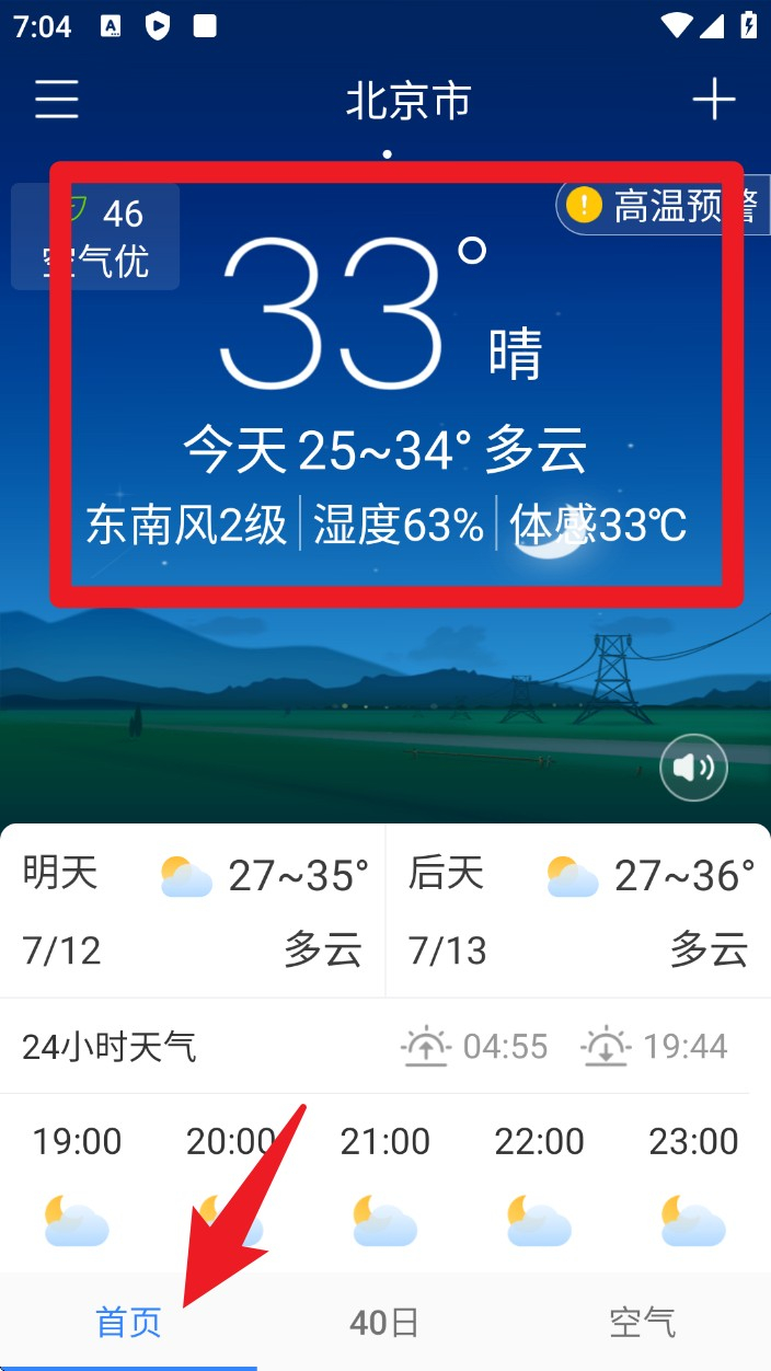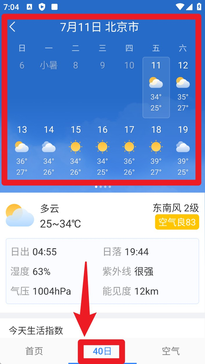 3. 在首页或“40日”界面中,滑动查看每小时天气预报及生活指数,如日出日落时间、紫外线强度等。