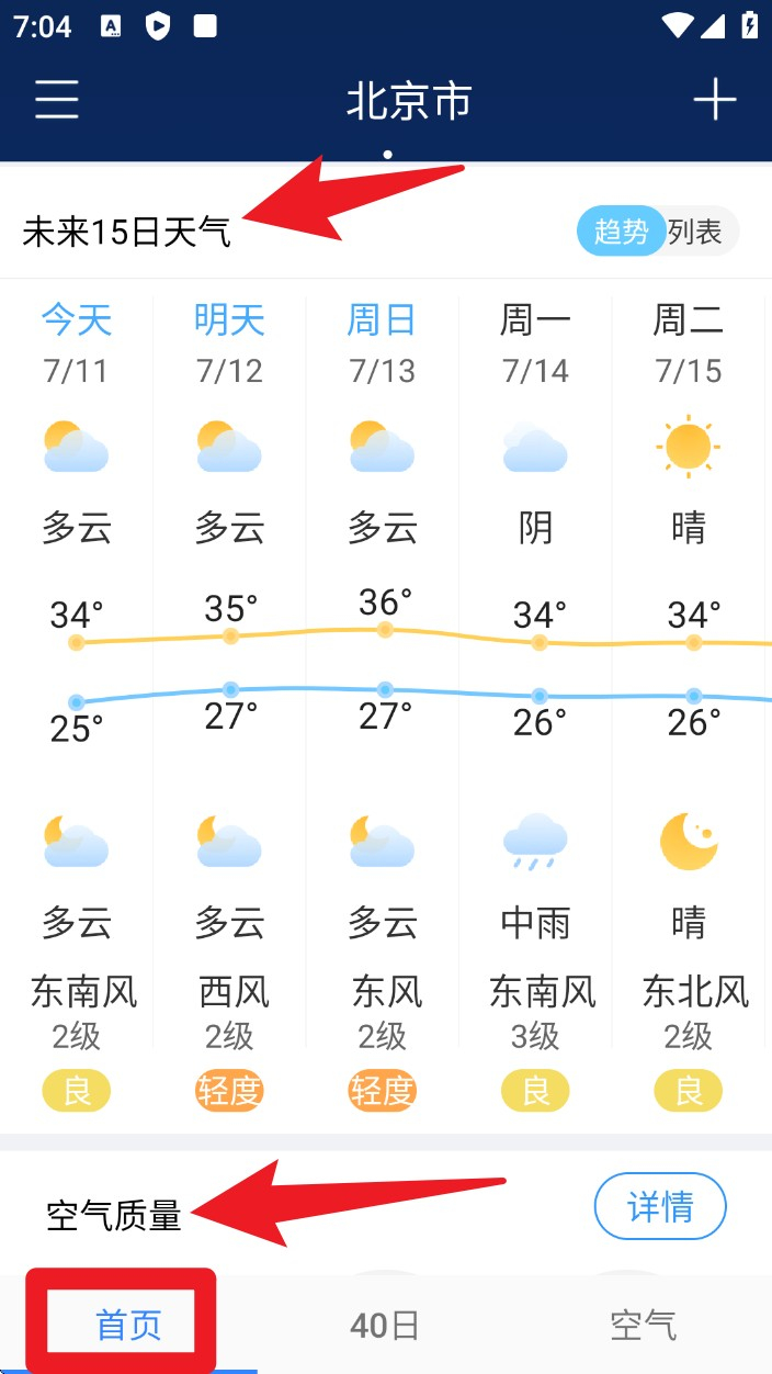 2. 点击下方“40日”按钮,进入未来天气页面,浏览多日天气趋势图及每日期间温差变化。