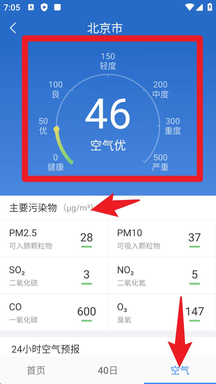 4. 转到“空气”标签,可以查看当前的空气质量指数、主要污染物的浓度以及相应的等级评估。