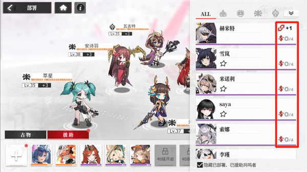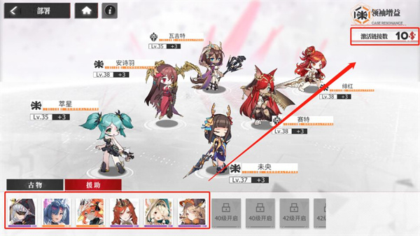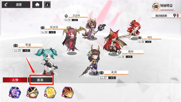 点击角色布局界面左下角的“援助”按钮,界面会替换掉“古物”,切换到援助角色布局界面。虽然援助角色不能参与战斗,但可以成为队伍角色链接技能的触发对象。