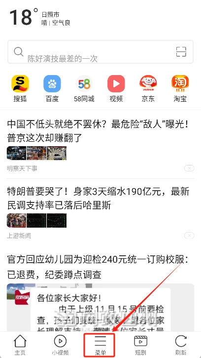 打开黑鲨浏览器应用,进入主屏幕后点击底部中央的菜单图标。