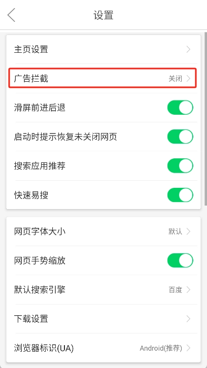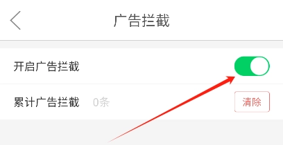 滑动菜单定位广告拦截功能,点击开启开关。