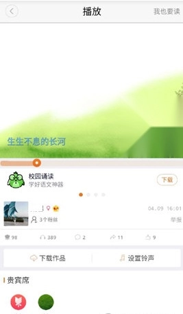 一键分享作品至社交平台。好友点赞和评价系统。情操培养通过经典诵读。作品下载支持本地保存。互动竞赛激发参与热情。更新频率每月一次。