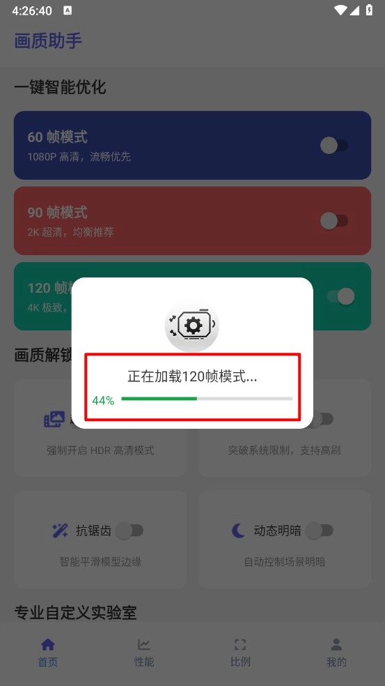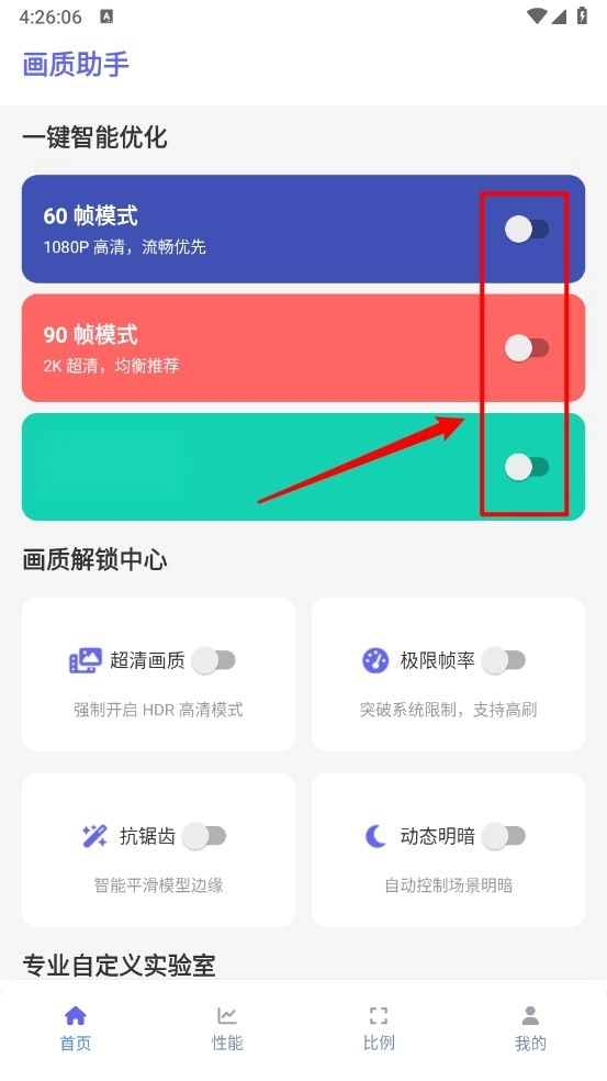 2. 首页提供多个智能帧率优化模式,选择适合的选项。