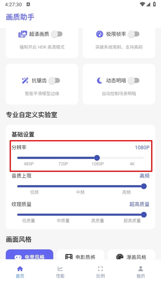 4. 滑动至底部,自定义分辨率、音质和纹理质量参数。